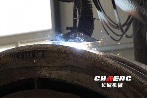 4、使用特種耐磨焊絲進(jìn)行明弧自動(dòng)焊,堆焊緩沖層和耐磨層,厚度12mm,表面花紋為一字紋或者菱形加點(diǎn)紋(客戶選擇)。保證外圓直徑達(dá)到圖紙要求。